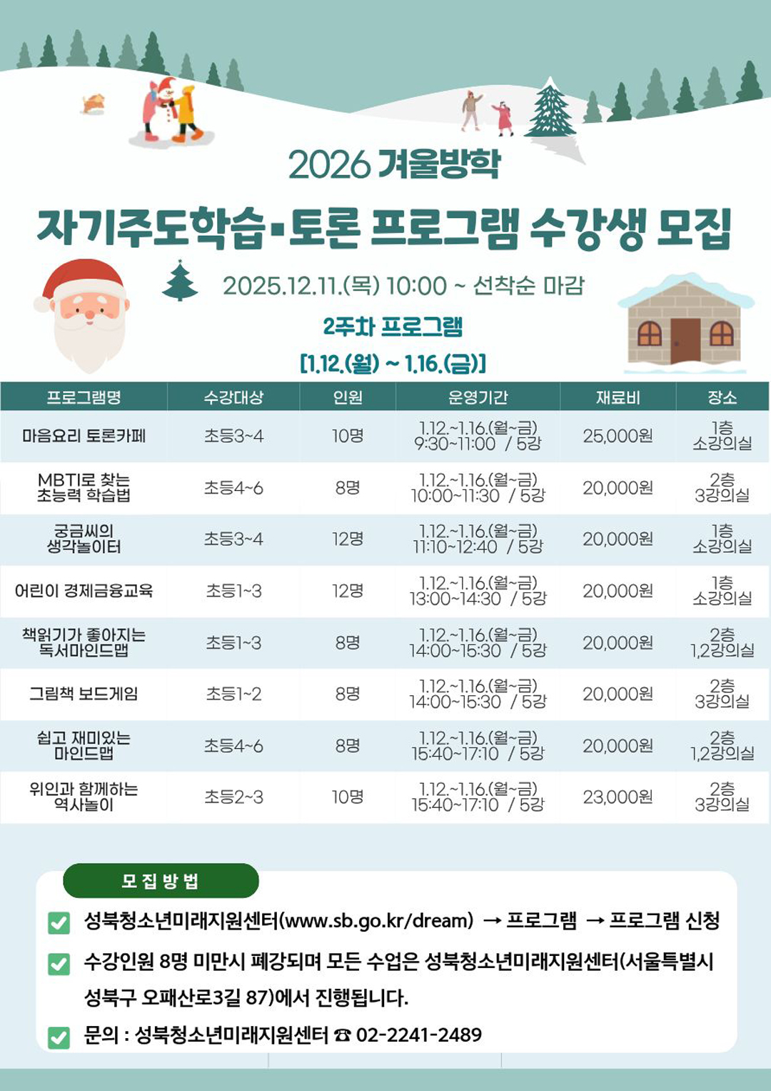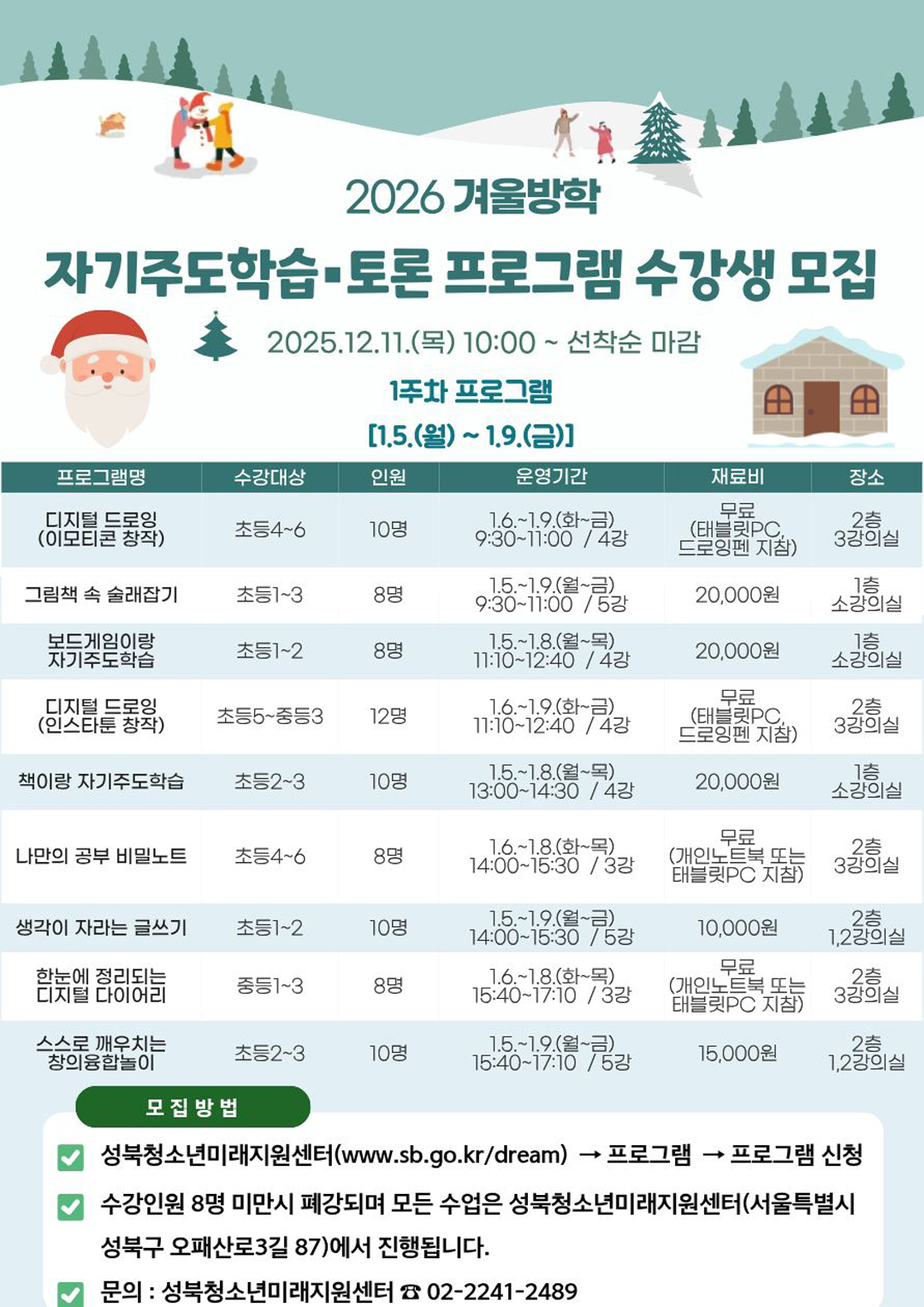 251130 2026년 겨울방학 자기주도학습·토론 프로그램 수강생 모집