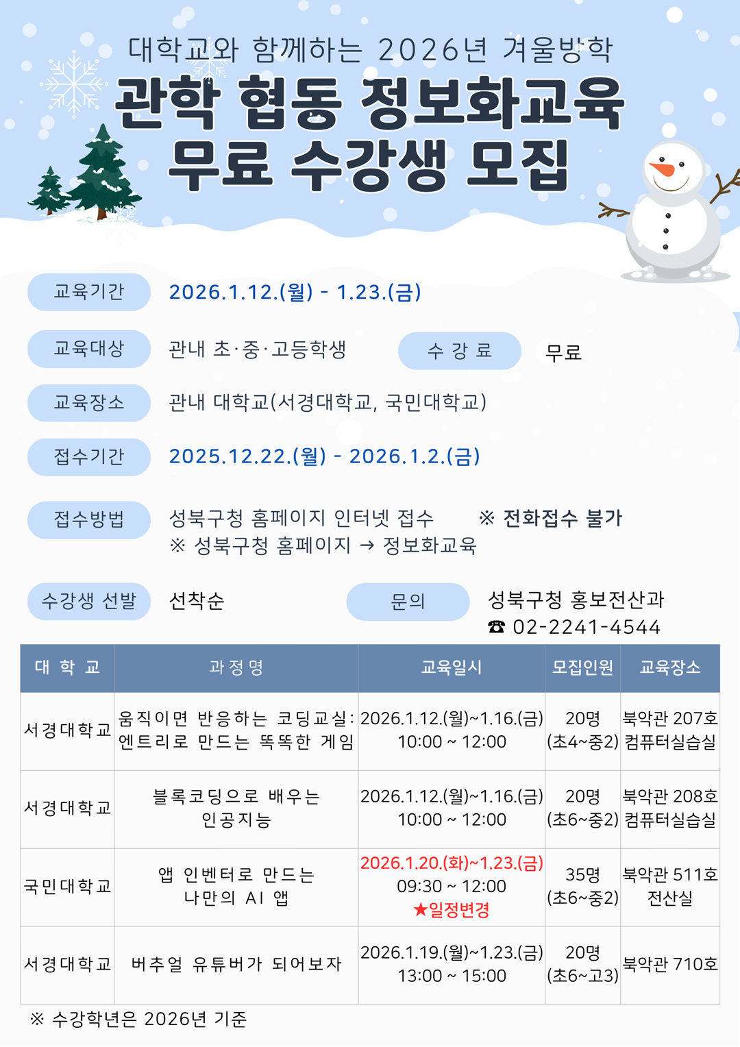 251215 2026년 겨울방학 관학 협동 정보화교육 무료 수강생 모집