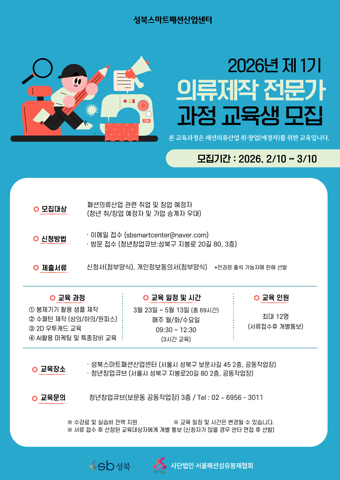 260205 [청년창업큐브] 2026년 제1기 의류제작 전문가과정 교육생 모집