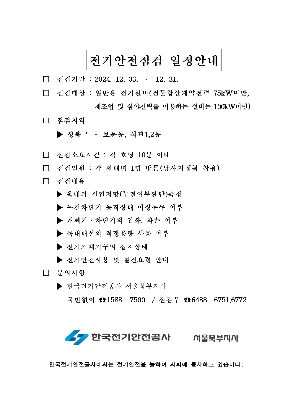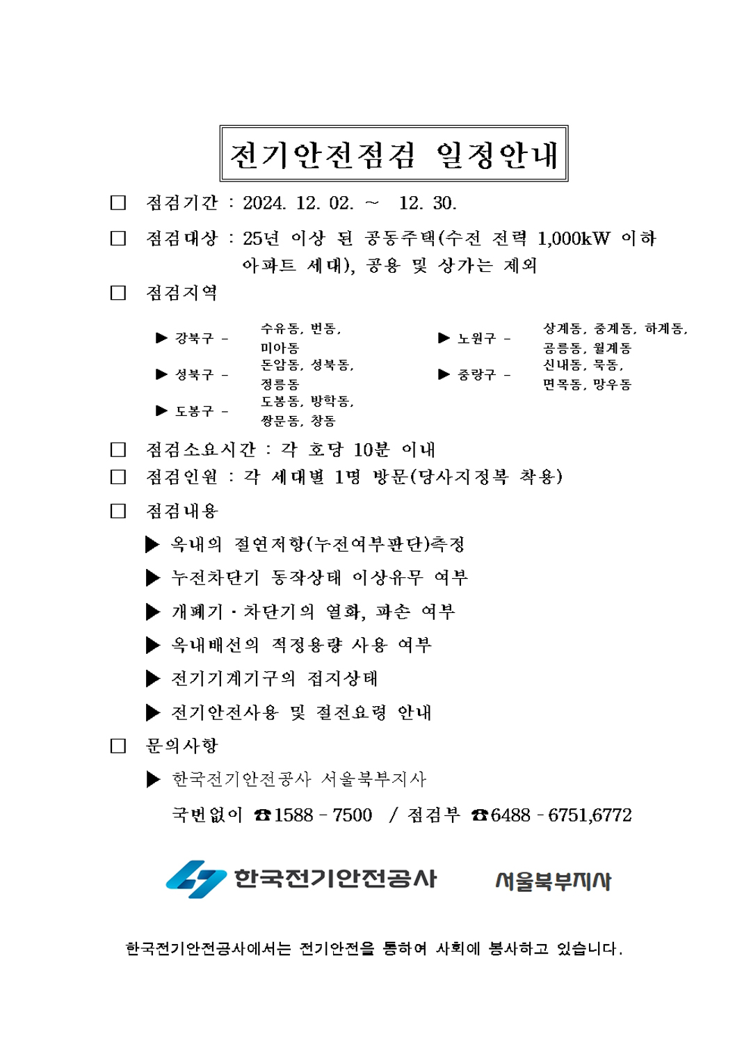 241118 12월 공동주택(아파트)세대별 전기설비 정기점검 안내