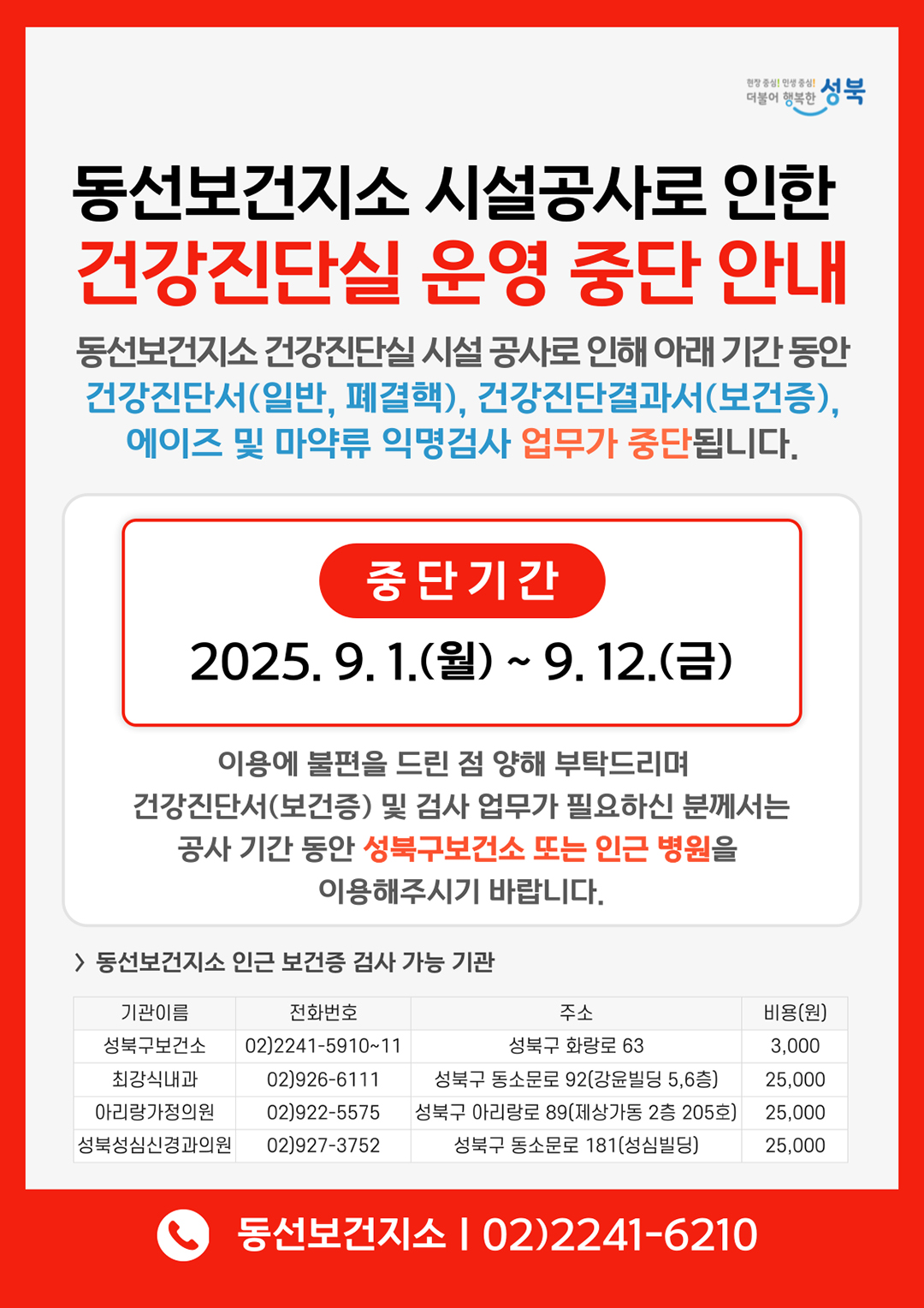 250825 동선보건지소 시설공사로 인한 건강진단실 운영 중단 안내